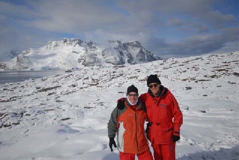 Barry Warren and son Vaughn in Antarctica in Feb '07, prior to the running of the Antarctica Marathon. Their ship, the Vavilov, is in the background.